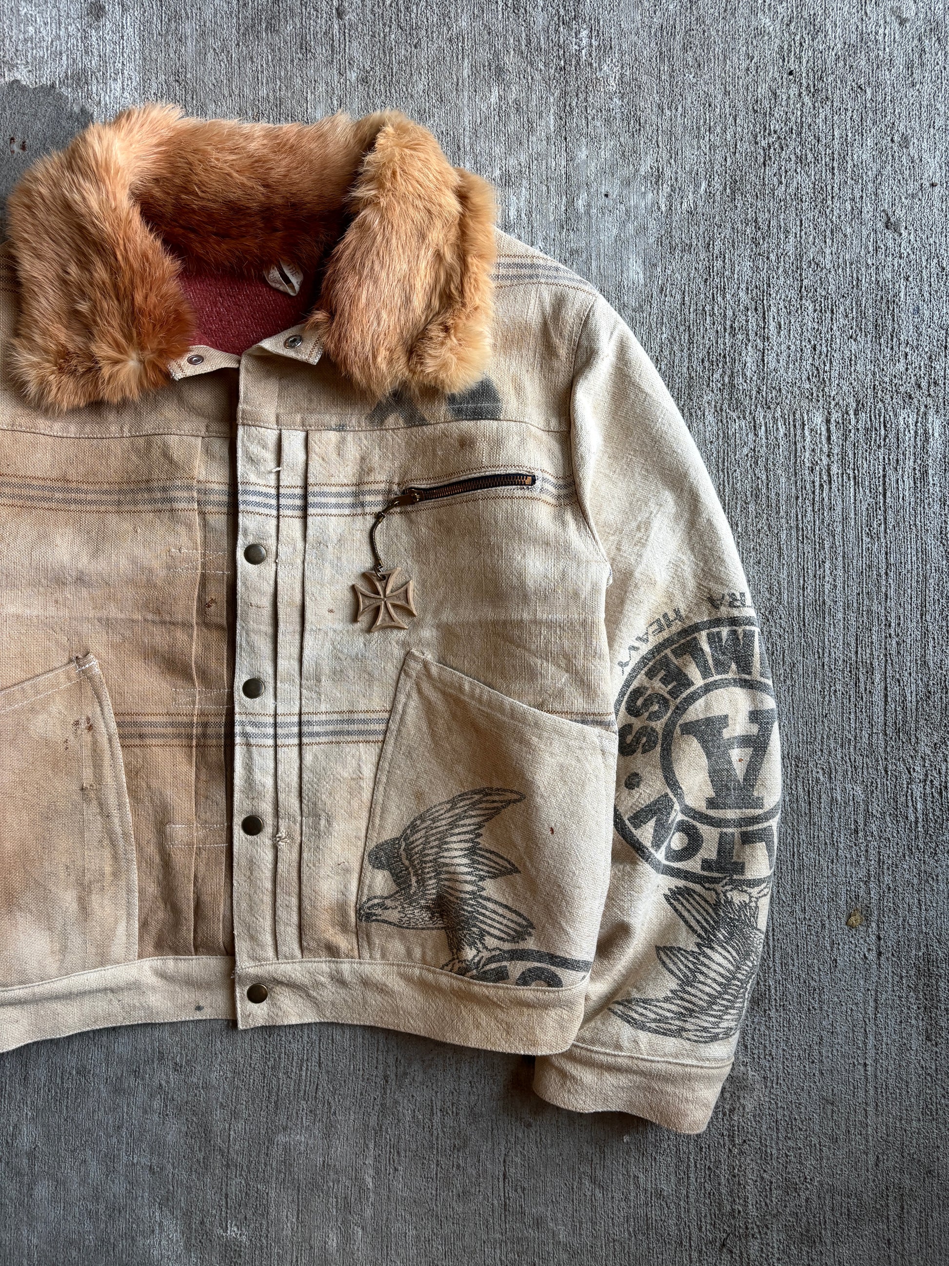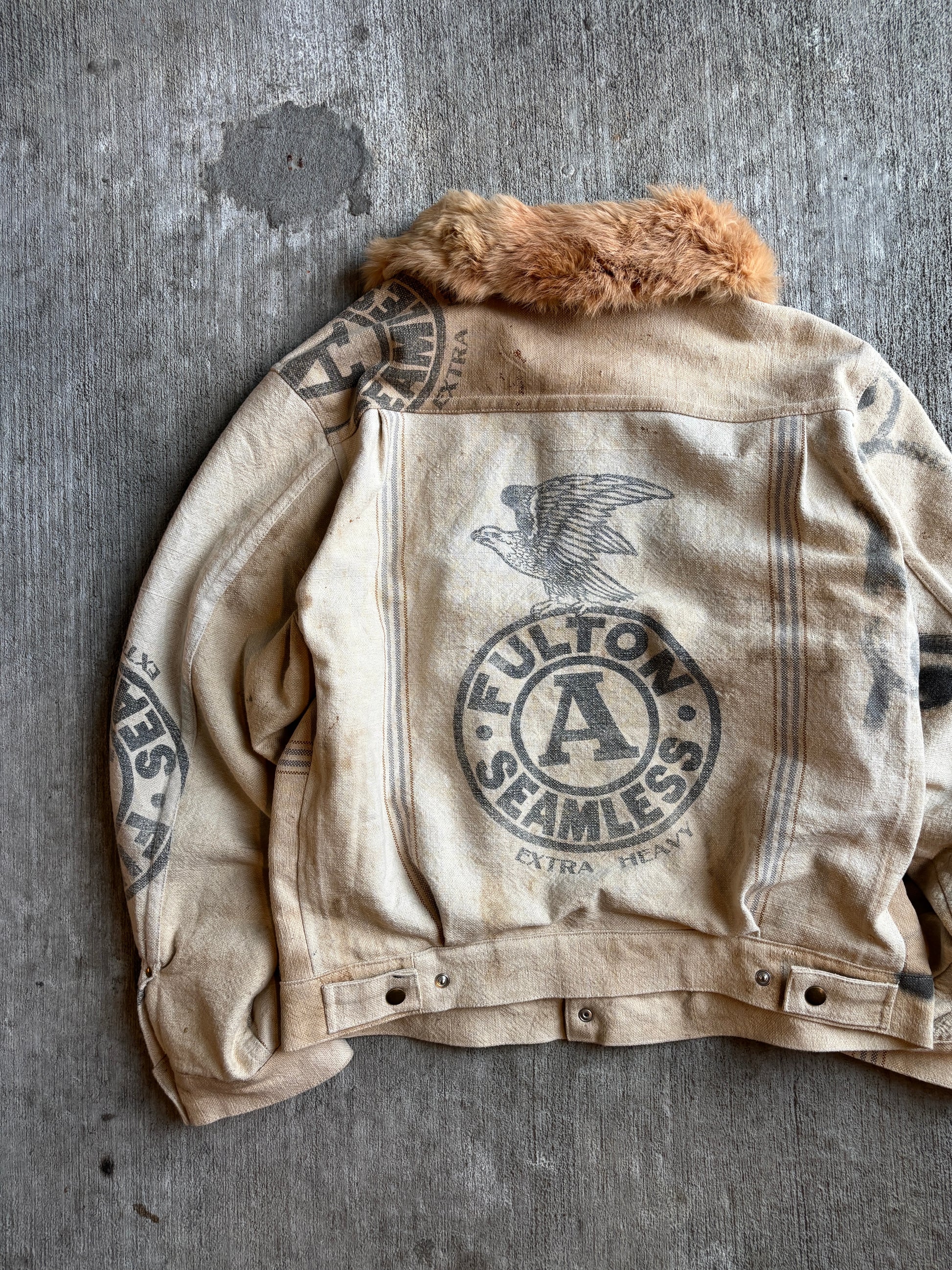 Made From Vintage Feedbags & Lined w/ 60s Camp Blanket. Delicate Wash Cycle Recommended. Please Review All Photos, All Sales Final. Cut & Sewn In Nashville, TN. Will Not Be Made Again.